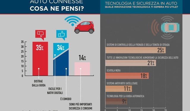 Il 35% delle persone coinvolte ritiene che le tecnologie che rendono le auto "iperconnesse" distraggano di più alla guida, e siano quindi da evitare. A meno che non siano nativi digitali, per i quali è tutto più facile (34%).