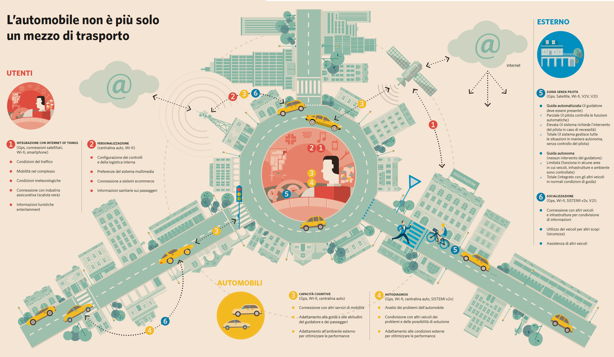 Una notizia su Il Sole 24 Ore ci mostra un'infografica sull' auto, considerata non più solo un mezzo di trasporto ma come un sistema integrato con l'esterno, con altri veicoli e infrastrutture, per condividere informazioni.